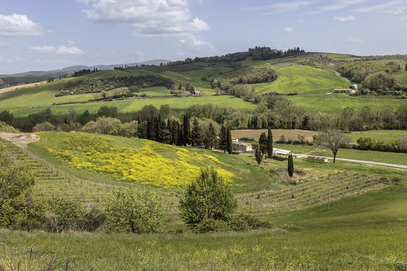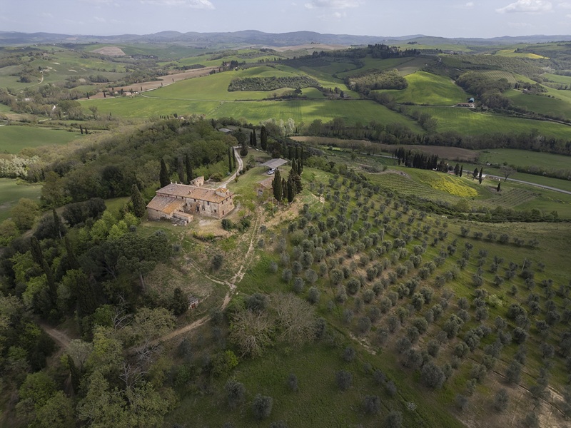 The estate reaches a maximum altitude of 350 meters above sea level, making it one of the highest hilltops in the area and offering breathtaking 360° views: Siena to the north, the Crete Senesi to the west, Montalcino and Monte Amiata to the south, and Lucignano d’Asso to the east.